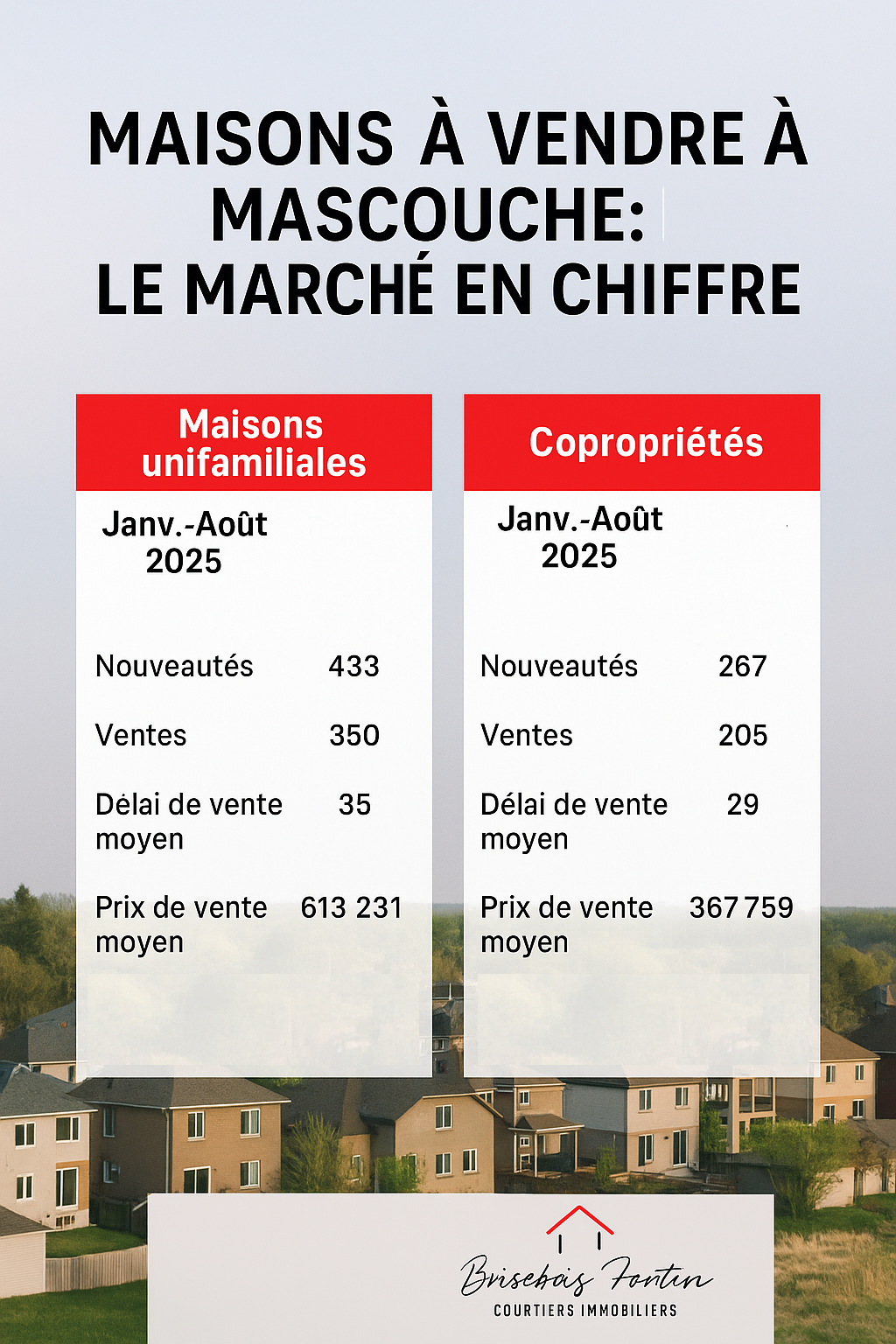 Le marché immobilier de Mascouche continue d’évoluer en 2025. Que vous cherchiez à acheter ou vendre une maison ou un condo à vendre à Mascouche, il est essentiel de connaître les dernières tendances. Voici un aperçu comparatif des données de janvier à août 2025 versus la même période en 2024.
